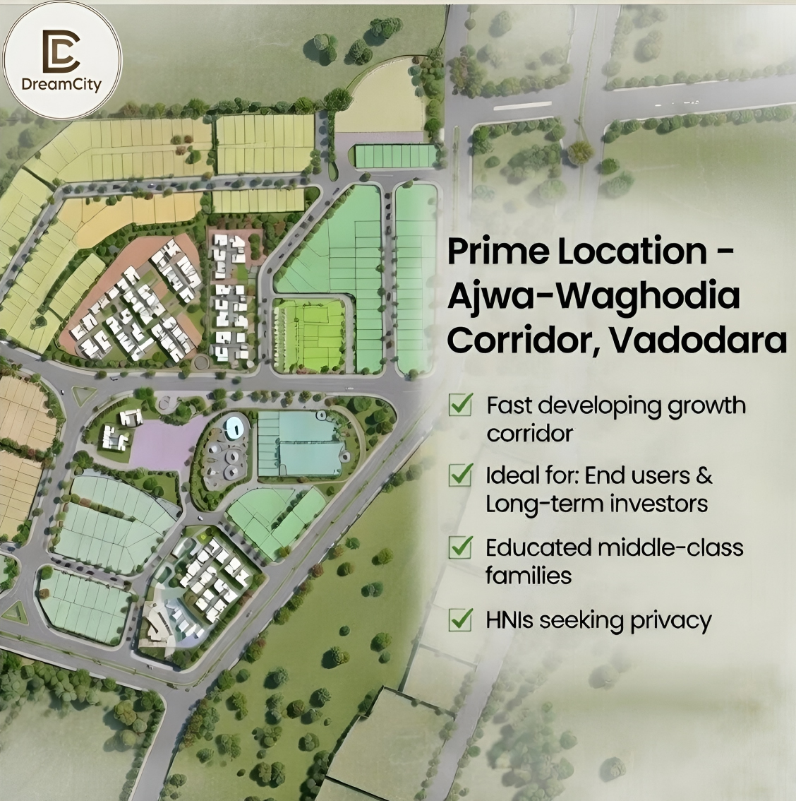 DreamCity is strategically located on the rapidly developing Ajwa–Waghodia growth corridor in Vadodara, making it one of the most promising residential destinations in the region. The location offers a perfect combination of peaceful surroundings, modern infrastructure, and excellent connectivity to major city areas.