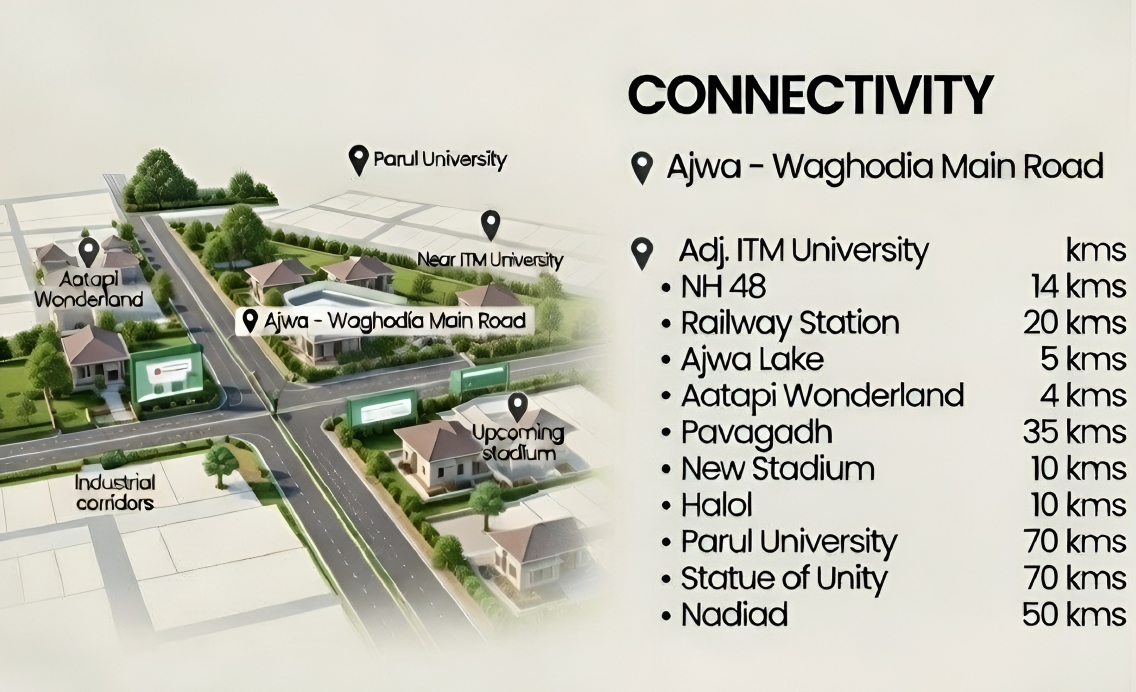 The project enjoys strong connectivity to major landmarks, highways, and key destinations around Vadodara, making daily travel easy and convenient.